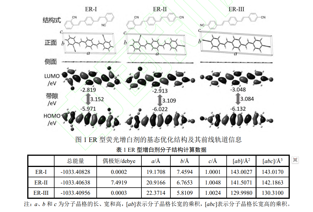 1. 实验部分 1.1 材料、试剂及仪器 材料 涤纶针织物(230 g/m2)。 试剂 增白剂 ER-I、增白剂 ER-II、增白剂 ER-III、消泡剂、石油醚、乙酸乙酯、N,N二甲基甲酰胺(DMF)、甲苯、非离子型分散剂(市售)。 仪器 TGA550 热重分析仪(美国 TA 仪器公司),Q2000 差示扫描量热仪(美国 TA 仪 器公司),HS82 熔点仪(瑞士梅特勒公司),756S 紫外分光光度仪(上海棱光技术有限公 司),F-4600 荧光光谱仪(日本日立公司),RTSM-0.5BJD 卧式砂磨机(上海儒特机电设 备有限公司),DYE-24 染色机(上海千立自动化设备有限公司),WSD-3C 白度仪(北京 康光光学仪器有限公司)。 1.2 理论计算方法 使用高斯 09 软件的密度泛函理论,在 B3LYP/6-31g 基组条件下计算获得增白剂分子的 基态优化结构,并进一步在 B3LYP/6-311++g (d,p)基组条件下计算获得增白剂分子的能量信 息。 1.3 增白剂的研磨方法 将增白剂、分散剂和水(质量比 2∶1∶7)配制所得混合液使用高速分散机进行预分散 (2000 r/min),根据起泡情况加入适量消泡剂。10 min 后将预分散液转移到卧式磨砂机中 进行砂磨并计时,使用纳米粒度分析仪监测分散液中增白剂颗粒粒径。砂磨结束后,出料、 备用。 1.4 涤纶增白方法 在染杯中加入经研磨的增白剂、水和织物(增白剂用量 x% owf,浴比 1∶30),随后将 染杯置于染色机中进行上染增白(入染温度 40 ℃,升温速率 2 ℃/min,保温温度 130 ℃, 保温时间 60 min),上染结束后降温至 40 ℃,取出试样,水洗,晾干。 1.5 白度及颜色参数的测试方法 使用白度仪测试并记录增白涤纶织物的白度值和颜色参数,每个样品测试 3 次,取平均 值。 1.6 上染率的测试方法 取染前液和染后液各 1 mL,使用紫外-可见分光光度仪测试染前液和染后液的吸收光谱, 记录最大吸收波长处的吸光度值,上染率按式(1)计算: 上染率 (1) 式中,A1 为染前液的吸光度值,A2为染后液的吸光度值,m 为染前液的稀释倍数,n 为染后 液的稀释倍数。 2. 结果与讨论 2.1 结构比较 增白剂 ER-I、ER-II 和 ER-III 的分子结构模拟计算结果如图 2 和表 1 所示。从侧面视角 看,3 种增白剂的基态优化结构均为平面结构。这有利于提升增白剂分子与纤维或其他基质 之间的相互作用,但同时也会增强分子间相互作用,促进增白剂分子聚集。增白剂分子呈现长条状。在所研究的 3 种增白剂体系中,随着氰基由邻位逐步转移至对位,增白剂分子晶格 长度逐渐增加,宽度逐渐减小,而高度基本保持不变。增白剂分子晶格[ab]面的面积以及晶 格体积均以 ER-I 最大,ER-II 次之,ER-III 最小。因此,ER-I 分子间作用力最强,ER-II 次 之,ER-III 最小。 ER 型增白剂分子中的氰基位置对分子能量及前线轨道能级具有显著的影响。ER-II 的 总能量最高,ER-I 次之,ER-III 最低。该结果表明,ER-III 的结构相对最稳定,ER-II 相对 最不稳定。3 种增白剂分子前线轨道的电子云密度均匀分布于整个分子的 π-共轭体系上,丰 富的电子云密度有利于增强增白剂分子间的静电力相互作用。最高占据轨道(HOMO)能 级由 ER-I 的-2.819 eV 逐渐降低至 ER-III 的-3.048 eV,最低空轨道(LUMO)能级由 ER-I 的-5.971 eV 逐渐降低至 ER-III 的-6.132 eV。由于 LUMO 能级的降低更为显著,能级带隙 因此也由 ER-I 的 3.152 eV 逐渐减小至 ER-III 的 3.084 eV。 经计算,ER-I 和 ER-III 的偶极矩接近 0,这与 ER-I 和 ER-III 在基态时的分子结构具有 显著对称结构特征相对应。ER-II 分子呈现非对称结构特征,使得 ER-II 的偶极矩达到 7.4919 debye。增白剂分子的偶极矩与其极性具有一定的关联。如图 2 所示,采用薄层色谱法验证 了 3 种增白剂的极性大小。在相同极性展开剂条件下,ER-I 的比移值(物质移动距离与溶 剂前沿移动距离的比值)最高,ER-III 次之,ER-II 最小。因此,3 种增白剂的极性大小关 系为 ER-I<ER-III<ER-II。