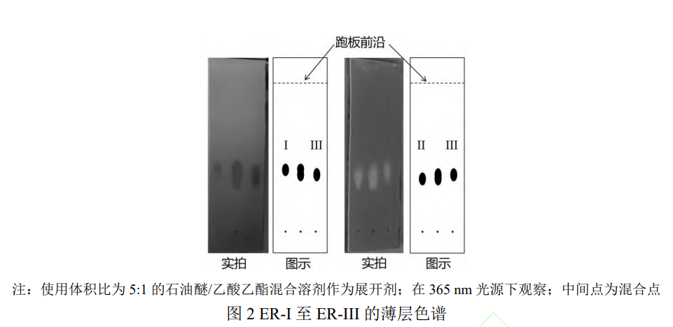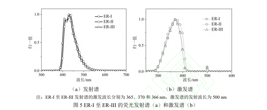 3 种增白剂在 DMF 中的荧光发射谱和激发谱如图 5 所示。ER-I 至 ER-III 的荧光发射谱 位于 390~550 nm 处,最大发射波长分别为 431、436 和 431 nm。ER-I 至 ER-III 的激发谱位 于 290~410 nm 处,基本与它们的吸收光谱重叠,最大波长分别为 371、372 和 371nm。相 比 ER-I 和 ER-III,ER-II 的发射谱和激发谱均表现出一定的红移现象,这对最终增白产品的 色光可能会带来一定的差异。