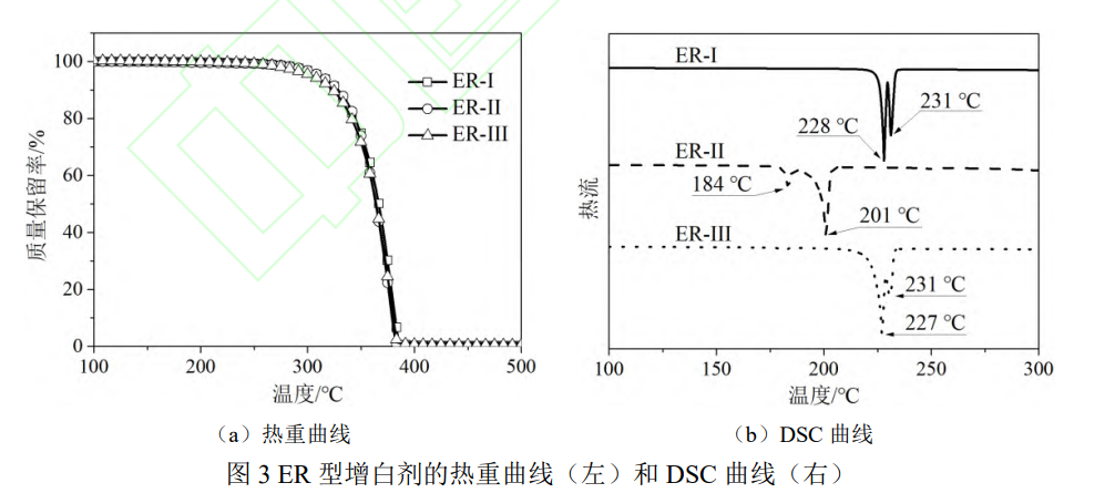 2.2 热性质比较 使用熔点仪测得 ER-I 的熔点为 224~226 ℃,ER-II 的熔点为 185~187 ℃,ER-III 的熔点 为 221~223 ℃。ER-I 和 ER-III 的熔点显著高于 ER-II 的熔点。该结果反映出与具有非对称 结构的 ER-II 相比,具有对称结构的 ER-I 和 ER-III 的分子排列更加规整和有序。因此,ER-I 和 ER-III 需要更高的温度来使其熔化。ER-I 至 ER-III 的热重曲线如图 3(a)所示。在所测 试条件下,增白剂 ER-I 至 ER-III 在失重 5%时的温度分别为 311、311 和 302 ℃,表明三种 增白剂均具有良好的耐热稳定性。ER-I 至 ER-III 的差示扫描量热(DSC)曲线如图 3(b) 所示。三种增白剂均出现两个吸热峰。其中,第一吸热峰(较低温度处)的温度与该种增白 剂的熔点基本一致,表明该吸热峰为增白剂的熔融峰。上述热性质测试结果表明,ER 型增 白剂在印染加工中常使用的高温高压染色法、轧染热熔法或载体染色法条件下均能保持较好 的耐热稳定性。由于轧染热熔法的焙烘温度可能达到 180~200 ℃,在该温度条件下,ER-II 可能会发生一定的相转变现象。因此,在实际应用时,使用者应当关注该相转变对染色增白 效果的影响。