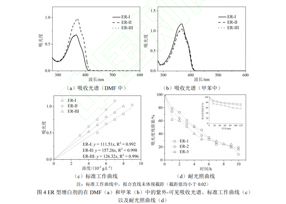 2.3 吸收性质比较 3 种增白剂在 DMF 中的紫外-可见吸收光谱如图 4(a)所示。由于 ER 型增白剂具有相 同的骨架,因此 3 种增白剂具有相似的吸收光谱曲线。ER-I 至 ER-III 在近紫外区 300~400 nm 区域的最大吸收波长分别为 367、371 和 367 nm。ER-II 不仅具有相对红移的最大吸收波长, 且在相同浓度下,ER-II 呈现出更强的吸收峰。作为对比,在以甲苯为溶剂的紫外-可见吸收 光谱(图 4(b))中,3 种增白剂的最大吸收波长均为 367 nm,且峰型基本一致。一般来说,有机分子形成吸收的本质包括 n-π*跃迁、π-π*跃迁和分子内电荷转移等。在 π-π*跃迁中, 溶剂极性增大会引起激发态能量下降,导致 π 轨道和 π*轨道能量差减小,进而引起 λmax 红 移。而在 n-π*跃迁中,大极性溶剂会与溶质分子 n 电子形成氢键,降低 n 轨道能级,使 n 轨道和 π*轨道能量差增大,进而引起 λmax 蓝移。据此分析可知,ER-II 在大极性溶剂中吸收 光谱的相对红移现象应当与其极性较大有关。ER-II 吸收特性的溶剂增强效应也表明 ER 型 增白剂在近紫外区的吸收光谱是由于分子 π-π*跃迁引起的。此外,3 种增白剂在 400~420 nm 的可见光区也有微弱的吸收现象。这是增白剂在粉状时呈现一定颜色的原因,也是当增白剂 用量较大时导致基材增白效果减弱的原因之一。通过记录不同浓度时增白剂分子在最大吸收 波长处的吸光度值,经拟合获得 ER 型增白剂在 DMF 中的标准工作曲线。拟合直线的线性 很好,表明 ER 型增白剂在低浓度下的吸收规律符合朗伯-比尔定律。ER-I 至 ER-III 的克消 光系数分别为 111.5、157.3 和 126.3 L/(g·cm)。 将增白剂溶于 DMF 中,配制成浓度为 6×10 -3 g/L 的稀溶液,随后在波长为 360 nm、功 率为 100 W 的紫外灯下照射,记录最大吸收波长处吸光度在辐照不同时间时的残留率,结 果如图 4(d)所示。在强紫外线照射下,3 种增白剂的二苯乙烯基苯母体迅速降解,至辐照 10 小时后,溶液中的 3 种增白剂分子含量下降了 80%以上。在辐照初期,ER-I 和 ER-II 的 降解较慢,ER-III 降解最快。由此可以看出,在相同条件下,ER-I 和 ER-II 的耐光照稳定性 要略好于 ER-III。
