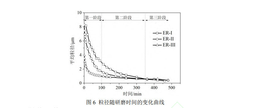 2.5 研磨特性比较 增白剂平均粒径随研磨时间的变化曲线如图6所示。增白剂的研磨过程可分为3个阶段, 包括粒径大幅下降阶段(第一阶段)、粒径缓慢下降阶段(第二阶段)和粒径维持阶段(第 三阶段)。在第一阶段,由于研磨介质(锆珠)的作用,增白剂固体大颗粒在碰撞中快速解 体变成细小颗粒。所使用增白剂在粉状时的平均粒径约为 70~80 μm。当研磨进行至 100 min 时,增白剂粒径已经降至 1~3 μm。在第二阶段,增白剂颗粒明显变小,此时使增白剂颗粒 解聚并进一步降低增白剂粒径的难度增大,因此,粒径下降速度减慢。粒径变化曲线反映出 增白剂颗粒解聚的难易程度为 ER-I>ER-II>ER-III。例如,为使增白剂平均粒径达到 1 μm, ER-I 需要约 240 min,ER-II 需要约 180 min,而 ER-III 仅需约 90 min。该结果可通过比较分 子结构来解释。从 ER-I 至 ER-III,分子[ab]面的面积逐渐减小,分子间作用力逐渐减弱,因 此,增白剂大颗粒的解聚也变得相对容易一些。3 种增白剂的粒径变化曲线相交于约 360 min 时,该处粒径约为 0.55 μm。在研磨第三阶段,增白剂颗粒在研磨体系中基本达到解聚和聚 集的平衡,粒径变化更加不明显。不过,ER-I 的粒径仍然存在逐步减小的趋势,而 ER-II 和 ER-III 的粒径减小趋势不再明显。这可能是由于 ER-I 更大的分子平面使其与分散剂的作 用强于 ER-II 和 ER-III,相对更好地抑制了 ER-I 分子的自聚集,从而促进 ER-I 颗粒粒径进 一步减小。