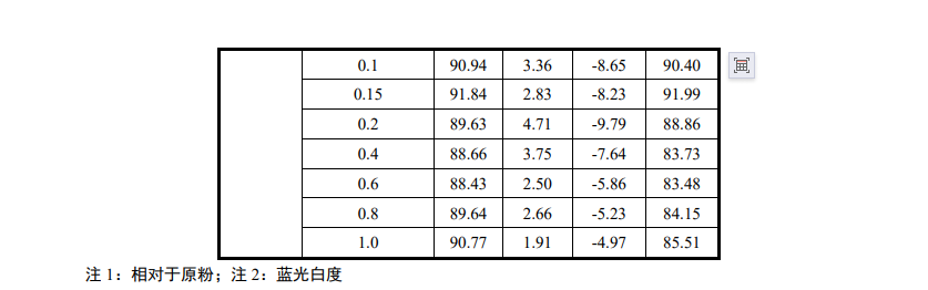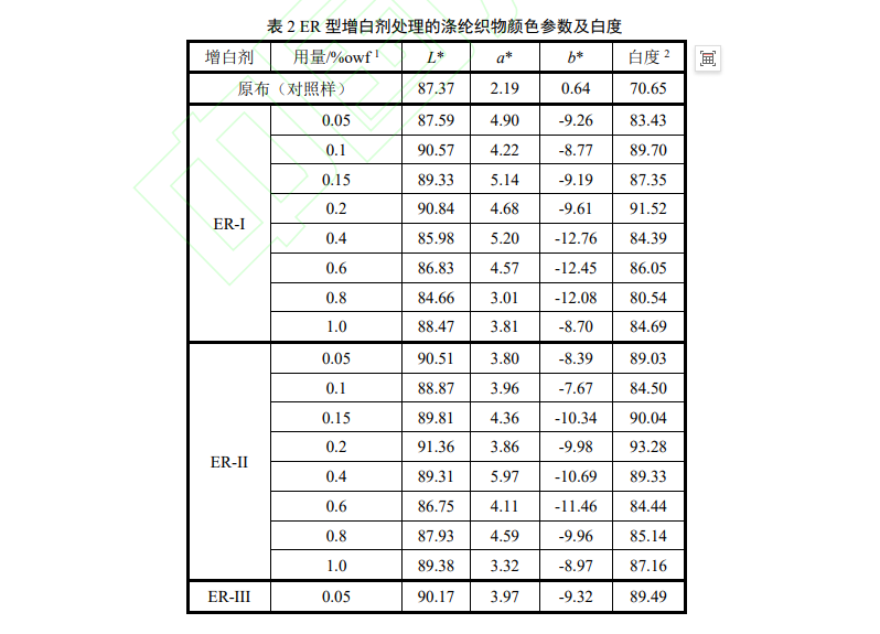 2.6 增白效果比较 将经过研磨处理的 3 种增白剂采用高温高压染色法对涤纶织物进行增白处理,得到染色 涤纶织物的颜色参数和白度值,如表 2 所示。与涤纶原布相比,经 ER 型增白剂处理的涤纶 织物具有显著的白度提升效果。例如,当使用 0.05% owf 的 ER-I 时,涤纶织物的白度值即 由原布的 70.65 大幅提升至处理后的 83.43,b*值(黄蓝坐标)由原布的 0.64 变为-9.26。ER-I 的泛黄点(即白度值不再增加时的增白剂用量)约为 0.2% owf,此时布样白度为 91.52。ER-II 的泛黄点约为 0.2% owf,对应的白度值为 93.28。ER-III 的泛黄点约为 0.15% owf,对应的 白度值为 91.99。在泛黄点以上使用增白剂时,涤纶织物 b*值的绝对值还会有所增加,但随 后又会显著下降。L*值和白度在泛黄点以上均明显下降。这是由于过量使用的增白剂发生 聚集诱导荧光淬灭以及增白剂本身的黄色所引起的。