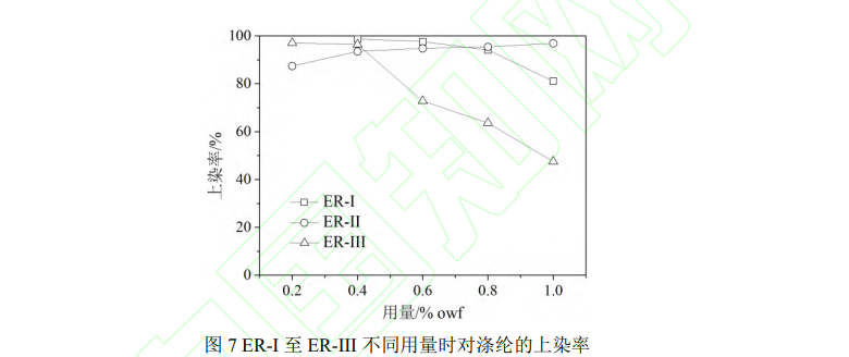 增白剂处理涤纶时的上染率数据如图 7 所示。在增白剂用量不超过 0.8% owf 时,ER-I 的上染率均达到 95%以上。ER-I 在用量为 1%owf 时的上染率略下降至 81%。ER-II 在不超 过 1% owf 的用量之内均保持了非常高的上染率。ER-III 在超过 0.4% owf 的用量时,上染率 即明显下降。上述结果表明,ER-II 与涤纶的亲和力最好,ER-I 次之,ER-III 最差。ER-II 较大的极性可能是提升其与涤纶亲和力的主要原因。ER-III 不仅极性与涤纶相差大,且可与 纤维作用的分子平面面积不足,从而导致其与纤维的亲和力偏弱。