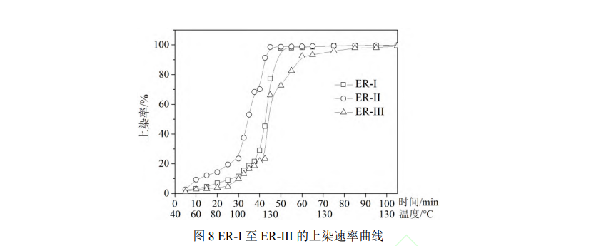 在 0.2% owf 的用量条件下,记录了增白剂对涤纶的升温上染速率曲线,结果如图 8 所 示。可以看出,相比 ER-I 和 ER-III,ER-II 的升温上染曲线整体相对左移,表明 ER-II 具有 更快的上染速率。ER-II 在低于 100 ℃的温度时即被涤纶纤维吸附一部分增白剂分子,随后 在 100~130 ℃的温度区间快速上染,并在温度达到 130 ℃时完全上染。ER-I 和 ER-III 不仅 在低温区的吸附量较少,且当温度达到 130 ℃时仍需保温一段时间才能达到完全上染的状态。 该结果再次表明,与 ER-I 和 ER-III 相比,ER-II 与涤纶具有更高的亲和力。